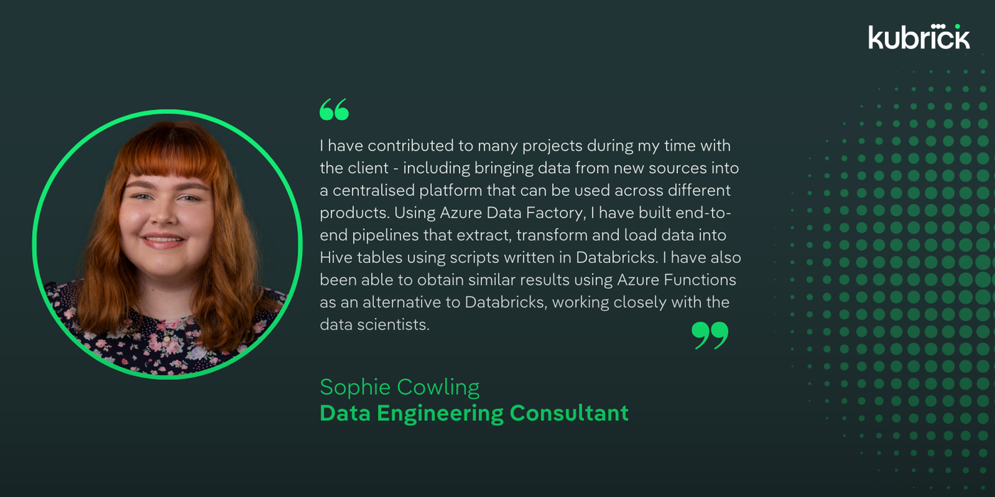 My name is Sophie and I joined Kubrick in May 2022 as a Data Engineering consultant. Once I completed my training, I was placed within one of the world's leading energy companies.